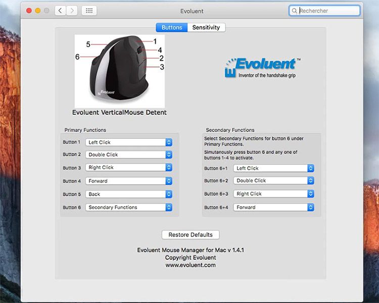 Disponible aussi bien sur Windows 7, 8 et 10 que sur Mac mais uniquement jusqu’à OSX Sierra 10.14, une mise à jour du pîlote pour Catalina 10.15 etant en cours développement, l’Evoluent Mouse Manager se loge dans les préférences système pour configurer simplement les boutons de la souris à partir de listes à choix unique.