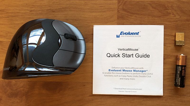 A l’intérieur de la boite se trouvent la souris sans fil, un dongle USB, une pile double A de taille R6, un guide de démarrage rapide sur lequel figure entre autres l’url du site www.evoluent.com pour pouvoir télécharger Evoluent Mouse Manager le logiciel de paramétrage de fonctions à attribuer aux boutons de la souris.