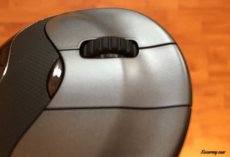 L’Evoluent D sans fil possède 6 boutons dont 5 boutons cannelés c’est à dire pensés pour bien épouser la forme des doigts. Les 2 utilisables par le pouce sont situés au-dessus et en dessous du repose-pouce tandis que le petit doigt  bénéficie d’un bord extra large pour éviter qu’il ne frotte contre la surface où repose la souris.