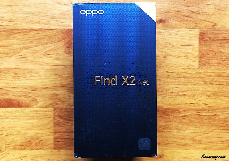Le packaging du Find X2 Neo est futuriste avec son fond bleu dégradé constellé de triangles. En lettres dorées dans le coin supérieur gauche se trouve le logo Oppo, à droite figurent quelques spécifications, au centre se situe l’appellation commerciale et en bas à droite une pastille indique la compatibilité 5G du téléphone.