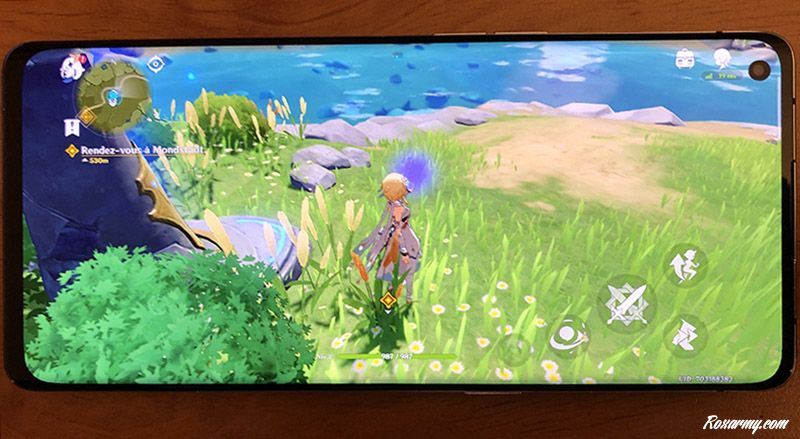 Grâce à une caméra frontale en poinçon et un menton quasi inexistant, le taux d’occupation de l’écran dépasse les 90%. Incurvé et AMOLED, la dalle de 2400 x1080 px sur 6,5 pouces combinée à un taux de rafraichissement de 90 Hz autorisent une jouabilité supérieure à celles des meilleures consoles portables.