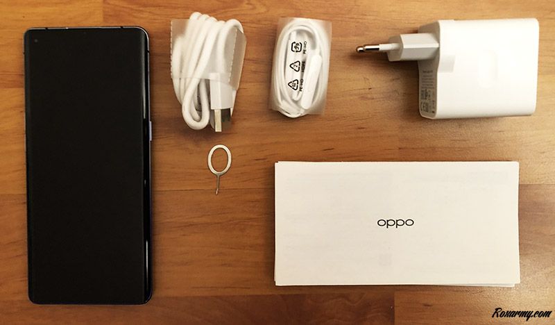 La boite en carton renforcé contient l’Oppo Find X2 Neo, un film protecteur préposé, un extracteur de cartes SIM, un câble USB de type C, un adaptateur secteur, des écouteurs intra auriculaires, un guide de démarrage rapide, un livret regroupant les informations importantes avec la carte de garantie constructeur.