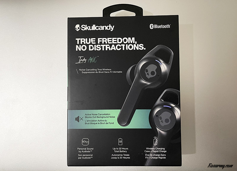 Le packaging des Indy ANC respecte les codes Skullcandy avec sur fond noir le logo et le slogan la véritable liberté, aucunes distractions. En dessous figurent le nom des intras, leur caractéristique principale et en regard leur visuel en vue 4/5ème surplombant un trio de fonctionnalités illustrées par des icônes.