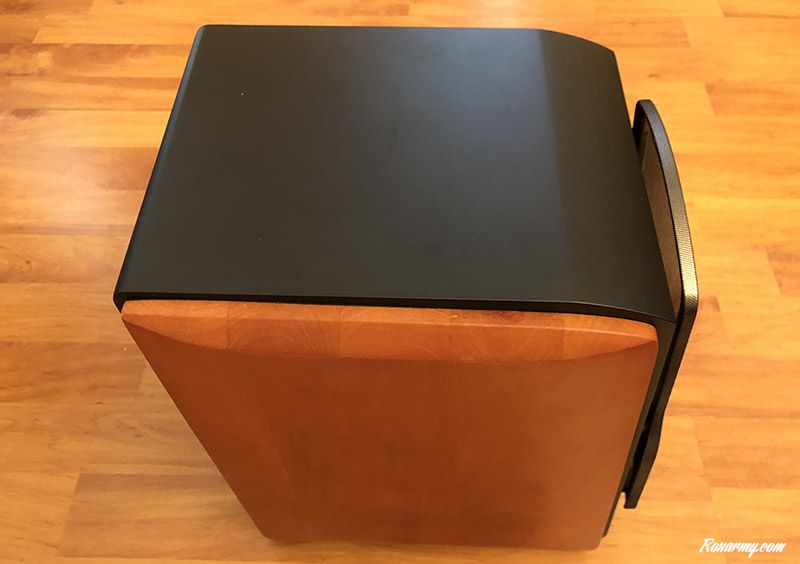 Un discret mais néanmoins visible témoin lumineux indique sous le Woofer de l’enceinte principale la source qui est sélectionnée. Ce dernier de 5.5 pouces à cône en aluminium mis au point par l’ingénierie allemande de la société Klippel permet d’éviter que les parties métalliques des enceintes interfèrent avec le rendu.