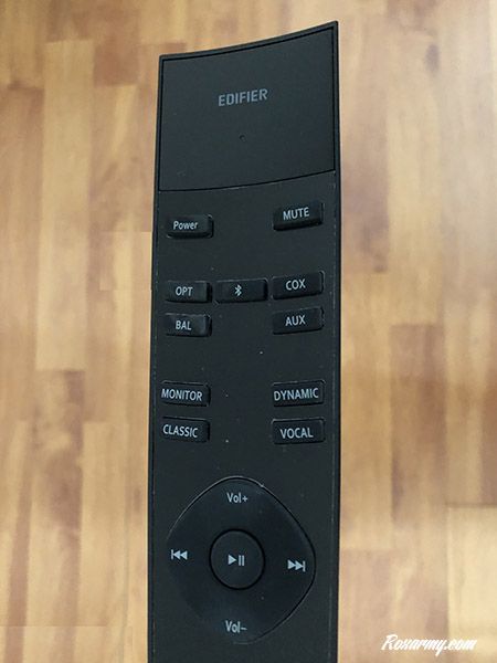 On retrouve sur la télécommande la possibilité de sélectionner directement la source. 4 préréglages d’équalisation Moniteur, Dynamique, Classique et Voix sont également disponibles. Telle la molette cliquable d’un ipod nano, une roue de contrôle située plus bas permet d’ajuster le volume et de faire défiler les pistes via Bluetooth 4.0.