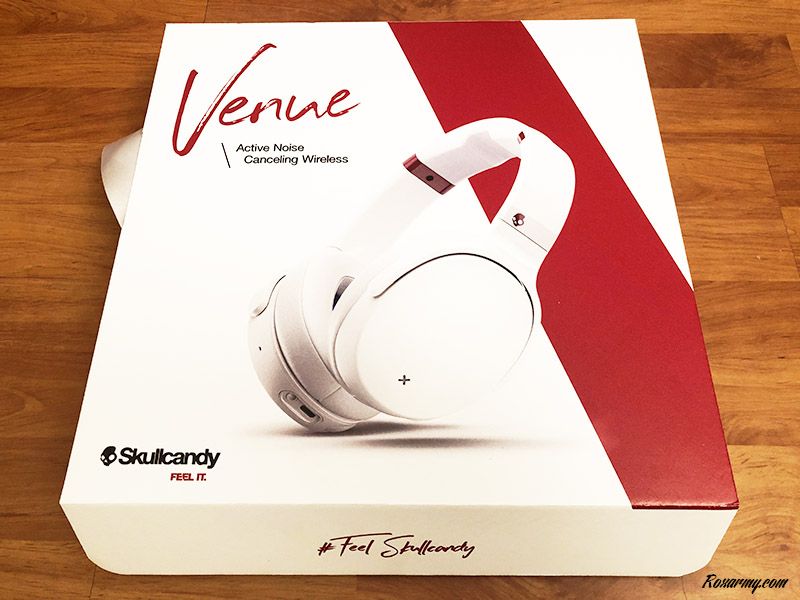 Le packaging du kit envoyé à la presse pour le Venue est magnifique avec un visuel du casque, son nom dans une police manuscrite, le rappel de ses principales innovations et en bas de la face supérieure du carton, le logo Skullcandy suivi du slogan Feel it (Ressens le dans la langue de Molière).
