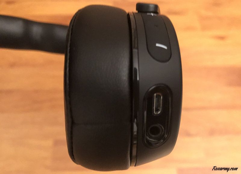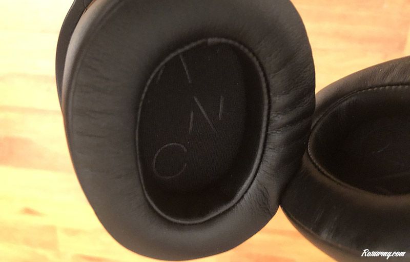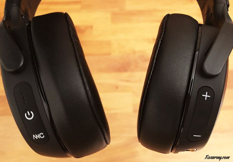 Sur l’écouteur gauche se trouvent des indicateurs de charge et des modes filaire, bluetooth et anti bruit. Juste en dessous figurent le bouton de mise sous tension utilisé également pour l’appairage. Enfin presser les lettres ANC (Anti Noise Cancelling) active ou stoppe la réduction de bruit active.