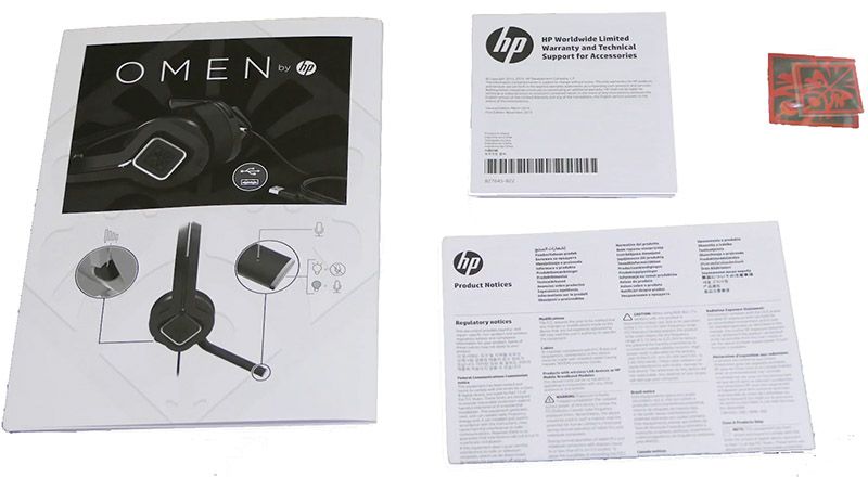 Pour dès l’ouverture donner l’impression d’avoir à faire à un produit premium, le casque d’HP, logé dans un carcan en plastique derrière une paroi translucide, est fourni avec un guide rapide d’utilisation, la garantie, un logo Omen autocollant et un feuillet regroupant diverses informations légales.