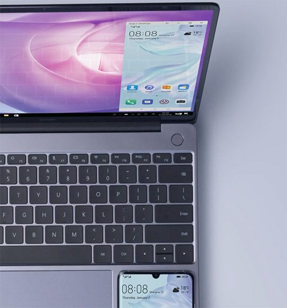 Pour activer le Huawei Share l’écosystème maison, il suffit de placer sur l’autocollant NFC du portable un des derniers téléphones de la marque. Son écran apparait et il est possible de glisser-déposer des fichiers, des images, des vidéos entre les 2 appareils, de répondre aux appels téléphoniques et même d’envoyer des sms depuis l’ordinateur.