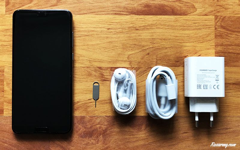 A l’intérieur de cette boite destinée à la presse se trouvent le P20 Pro avec un film de protection plaqué en standard sur son écran, un chargeur, un câble USB-C, des écouteurs intra auriculaires USB-C, un extracteur de carte SIM. Un guide de démarrage la garantie et une coque sont inclus dans la version commercialisée pour le grand public.
