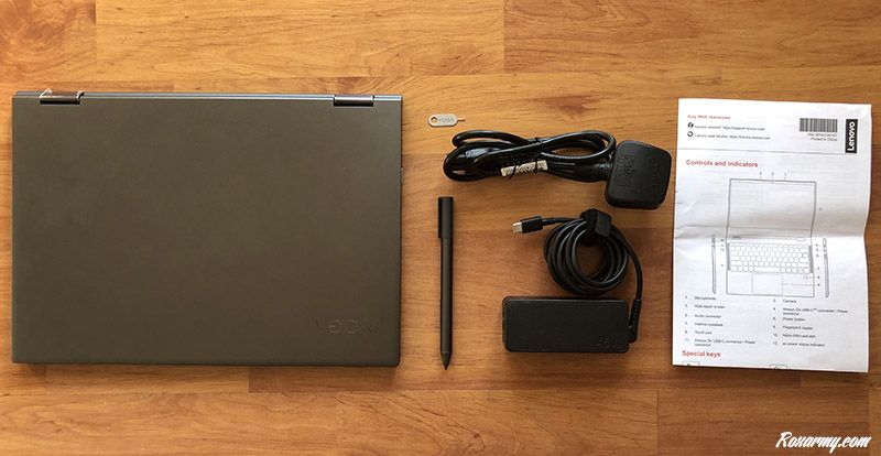 Sur le dessus du packaging en lettres turquoises s’affiche brillamment Yoga, la gamme à laquelle appartient le C630 avec en toile de fond une texture bitume. A l’extrême droite figure en police inversée le logo Lenovo. Il se dégage sans ouvrir la boite, l’impression d’avoir à faire à un produit premium.