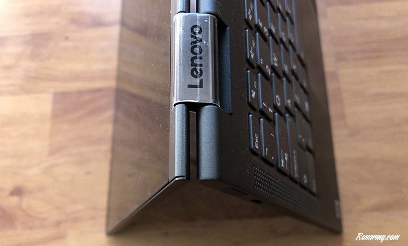 A l’avant comme à l’arrière, l’esthétique du Yoga C630 est vraiment sexy grâce à son revêtement en métal poli. Agréable au toucher, il a aussi comme propriété de capturer les traces de doigts. Heureusement un tel choix a aussi pour avantage de rendre le 2 en 1 totalement silencieux vu qu’il ne possède aucun ventilateur.