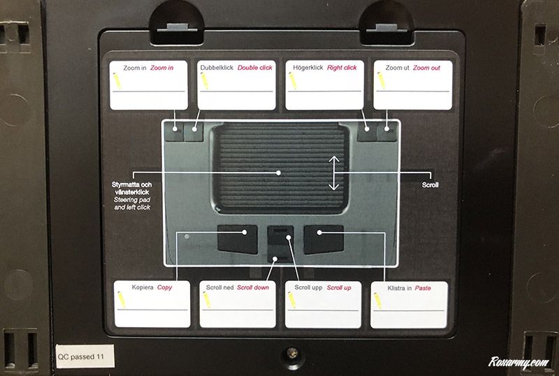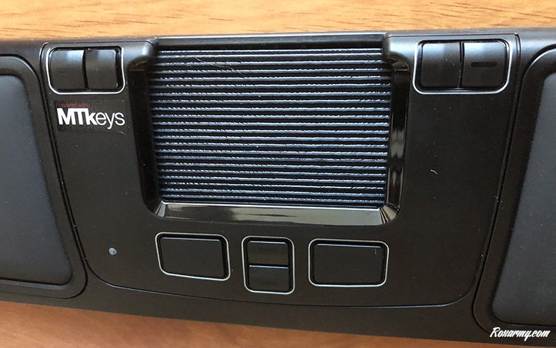 Pour une connexion sans fil, il suffit de brancher le dongle enfiché sur le côté droit de la MouseTrapper. Le pavé de commande fonctionne de manière mécanique un peu comme un tapis de course mais pour les doigts. Cliquable, il s’utilise d’avant en arrière comme sur les côtés. Il contient une zone de défilement vertical sur le bord droit.