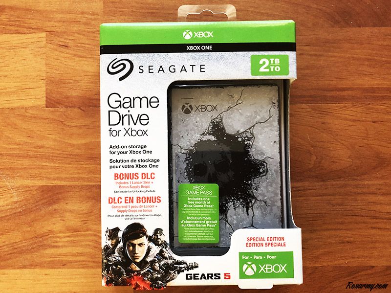 Le packaging de celui ayant pour thème Gears 5 reprend les caractéristiques du modèle classique de 2016 avec son encart en plastique transparent permettant d’apercevoir le disque. On retrouve également la signalétique Xbox, le logo Seagate, la capacité de stockage, le visuel de la jaquette Gears 5 et l’indication de DLC inclus.