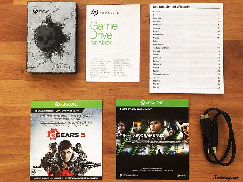 A l’intérieur de la boite figurent le Game Drive, un câble USB 3, un guide de démarrage rapide, la garantie constructeur, 2 feuillets sur lesquels est inscrit au dos un code. Le premier donne accès au Xbox Game Pass durant 1 mois. Le second permet de récupérer le skin Ice Bloc Lancer et un bonus de fourniture pour la partie multijoueur.