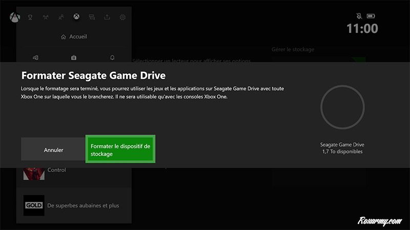 L’installation consiste à raccorder le disque au port USB de la console. Un choix est alors proposé pour le stockage de médias ou des jeux et applications. Pour cette option, il est obligatoire de déterminer si le Game Drive servira d’emplacement par défaut puis de le formater. Avec ses 2 To de capacité, il fonctionne alors comme le disque interne.