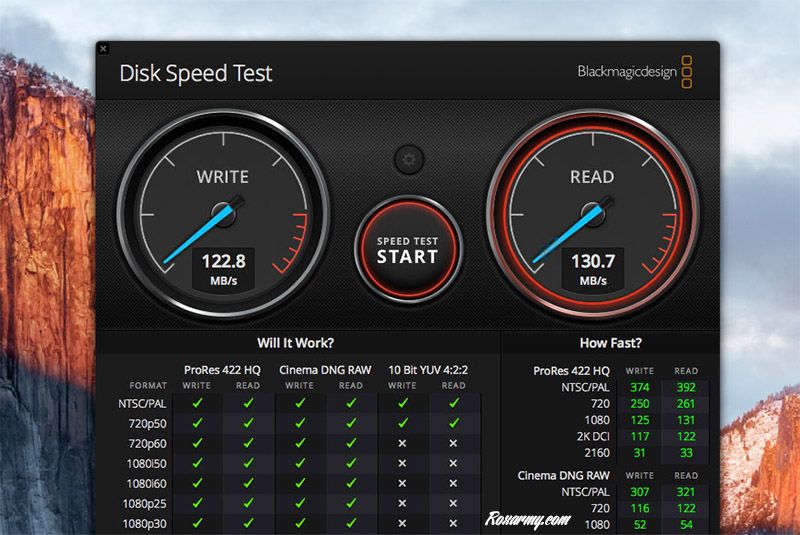 Avec des dimensions de 117 x 80 x14,9 mm pour 169g, ce disque SATA au format 2,5 pouces, tourne à 5400 t/mn. Ses performances via le Speed Test de BlackMagicDesign indiquent que ce modèle est légèrement plus rapide que son concurrent chez Western digital avec des taux en écriture de 122.8 MB/S et 130.7 MB/s en lecture.