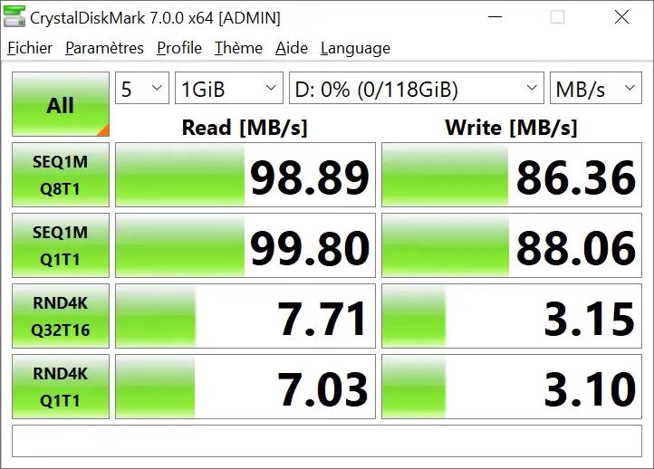 Si les résultats obtenus confirment ces données minimum en séquentiel, elles s’avèrent optimistes en aléatoire. Le transfert annoncé de 120 Mo/s en lecture est en réalité difficilement atteignable. CrystalDiskMark affiche au mieux 99,80 Mo/s en lecture. En revanche pour l’écriture la performance est meilleure soit 88,06 Mo/ au lieu des 60 Mo/s estimés.