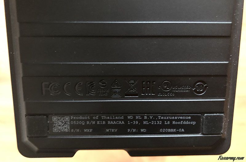 A l’arrière se disputent discrètement incrustés dans le boitier, les icones de conformité aux normes européennes, un QR code, les numéros de série et le pays de fabrication du disque à savoir la Thaïlande. Que ce soient sur PC, Xbox One ou PS4, l’installation consiste simplement à le brancher à un port USB.