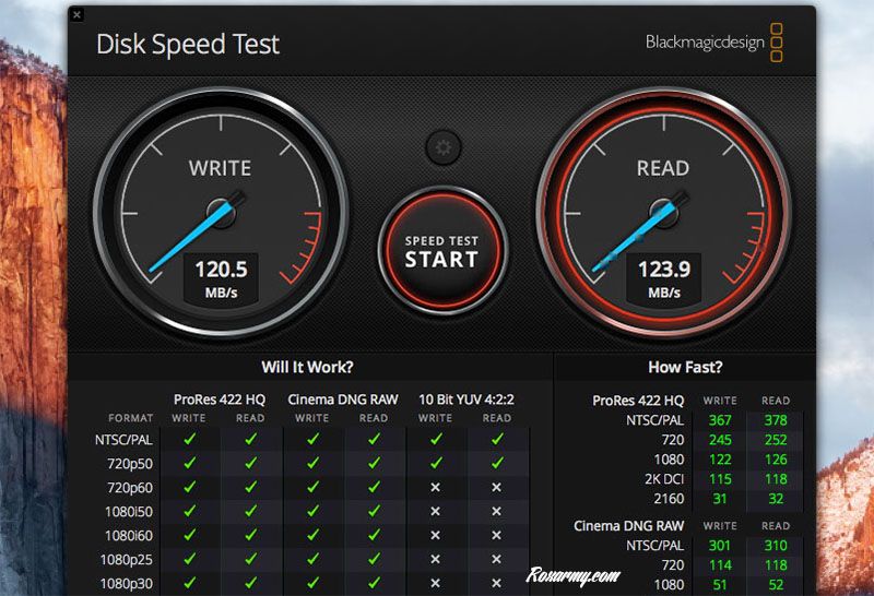 Si contrairement au SN750 NVMe SSD, aucun logiciel maison spécifique n’est mis à disposition par Western Digital pour évaluer le P10 Game Drive, le professionnel Disk Speed Test de BlackMagicDesign révèle que ce HDD possède des taux en écriture de 120.4 MB/S et de 125 MB/s en lecture.