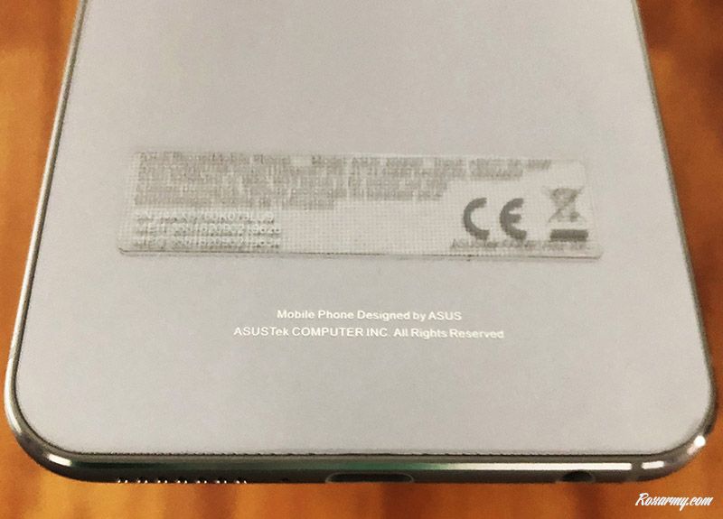Si l’entreprise taïwanaise a pris soin de préserver l’esthétique du recto en apposant les numéros de série, IMEI et les certifications aux normes européennes sur un sticker, une mention stipule au bas du téléphone que ce dernier été désigné par Asus. Il s’ensuit l’appellation complète de l’entreprise qui rappelle qu’AsusTek Computer Inc fabriquait historiquement des ordinateurs.
