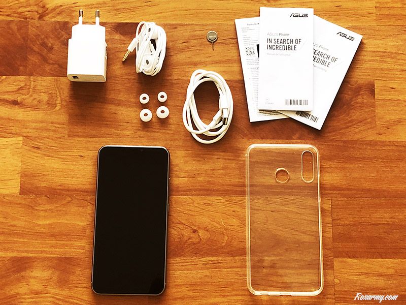 En l’ouvrant son contenu comprend le nouveau Zenfone 5, un chargeur, un câble USB-C, un extracteur de carte SIM, un manuel d’utilisation, de la documentation réglementaire, des écouteurs intra-auriculaires à prise jack avec 3 tailles d’embouts et une coque de protection dorsale en plastique transparent.