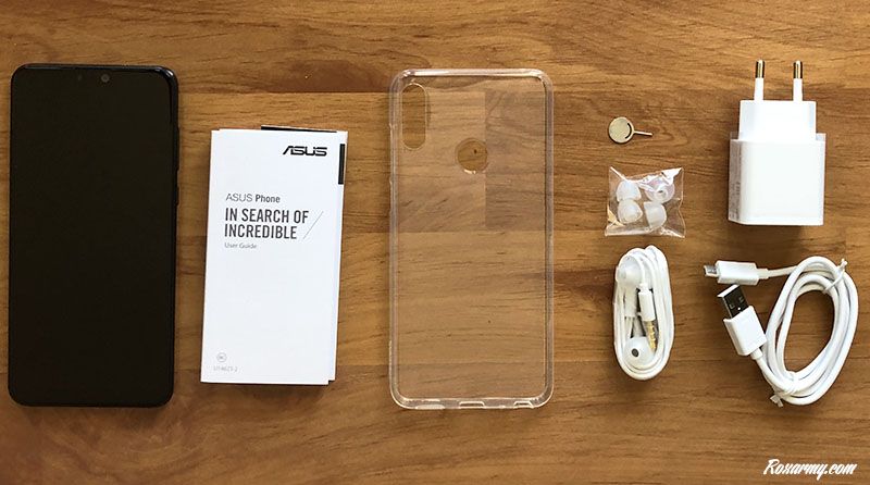 Le Zenfone Max Pro M2 est livré accompagné du guide de l’utilisateur, de la garantie, d’une coque de protection transparente, d’un extracteur de carte SIM, d’un casque intra auriculaire, de 3 paires d’embouts de petite, moyenne et grande taille, d’un cable micro USB et d’un chargeur d’alimentation.