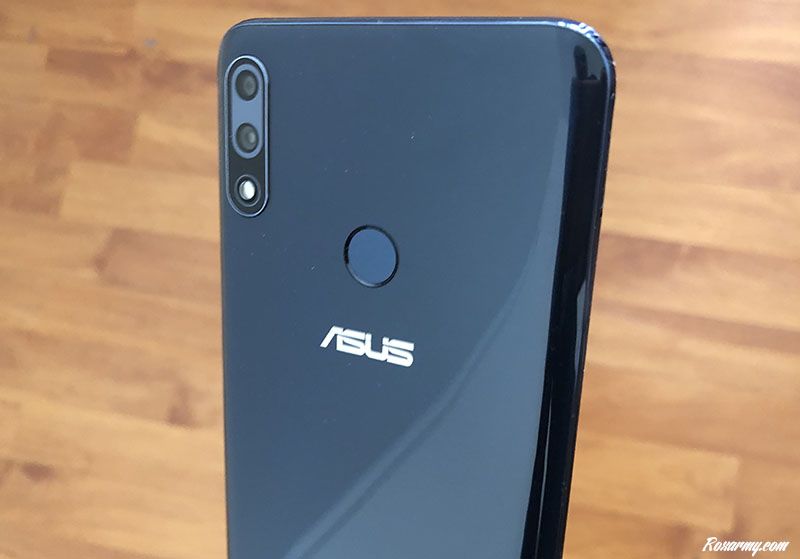 Le design du M2 est sobre, son revêtement arrière a été travaillé de manière à diffracter la lumière comme c’est la tendance. Avec ses 15,79 cm de long, 7,55 cm de large, une épaisseur de 8,8 mm pour un poids de 175 g, il tient bien en main et sa coque de protection l’empêche d’être marqué par une myriade de traces de doigts.Au dos se trouve juste en dessous du lecteur d’empreintes le logo Asus. A sa gauche figure un Dual Pixel IMX486. Le premier capteur de 12 MP est capable d’enregistrer en 4K  UHD (3840×2160). Le second à 5 MP dispose d’un champ de vision à 84°. Les éventuels selfies pris par la camera avant ont une résolution de 13 MP.
