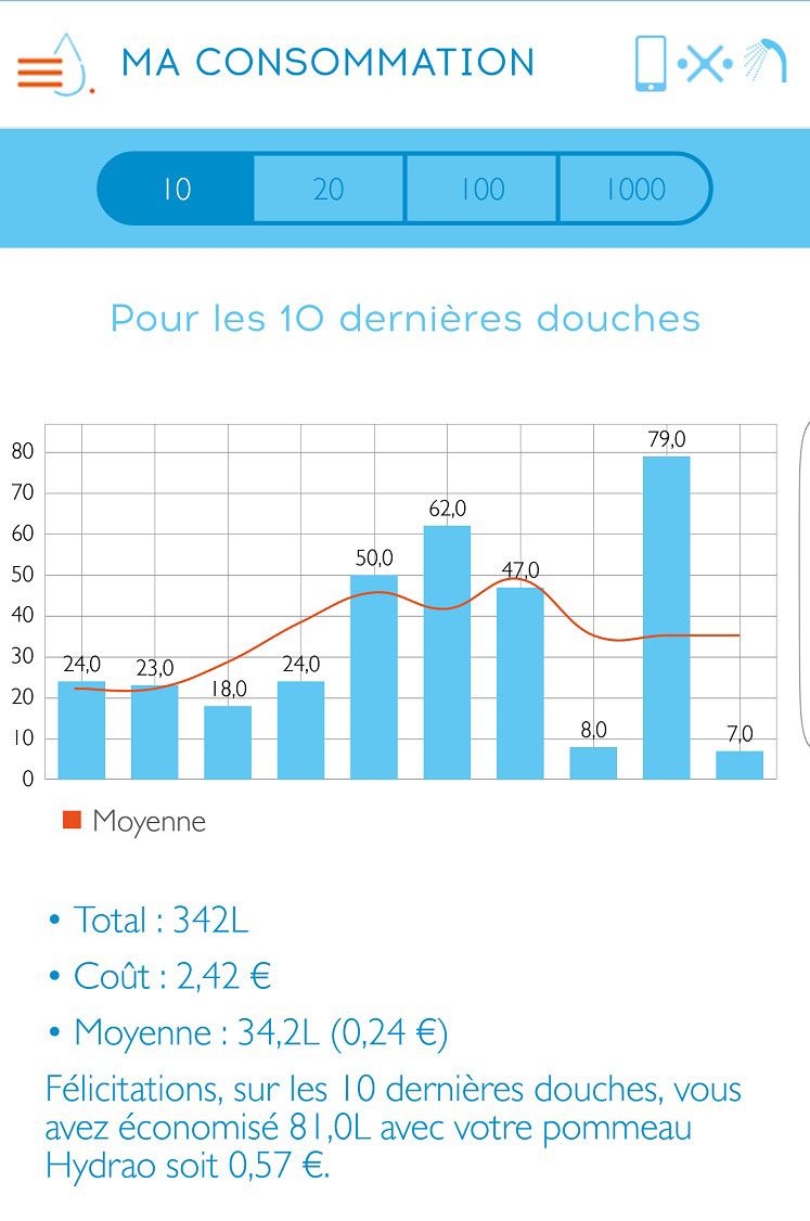 L’application permet aussi d’accéder à l’historique de vos douches, vous permettant ainsi de pouvoir évaluer vos progrès et vos consommations. L’Hydrao étant équipé d’une mémoire interne, il n’est pas nécessaire d’avoir son smartphone d’activé à chaque douche. En effet, cette mémoire permet d’enregistrer jusqu’à 200 douches.