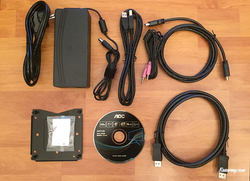 Sur sa boite, le visuel de l’écran affiche un samouraï et un cheval ailé ne laissant planer aucun doute sur la vocation de l’AG271UG. En dessous sont rappelées sous force d’icones ses caractéristiques principales tandis que que sous le logo Agon AOC Gaming figurent la référence et une photo de l’écran vu de dos.A l’intérieur en plus de l’AG271UG se trouvent l’alimentation et son câble, un câble HDMI, un câble Displayport, un câble USB, un câble audio jack, la documentation sur CD-ROM et un système de fixation mural avec 4 vis fournies.