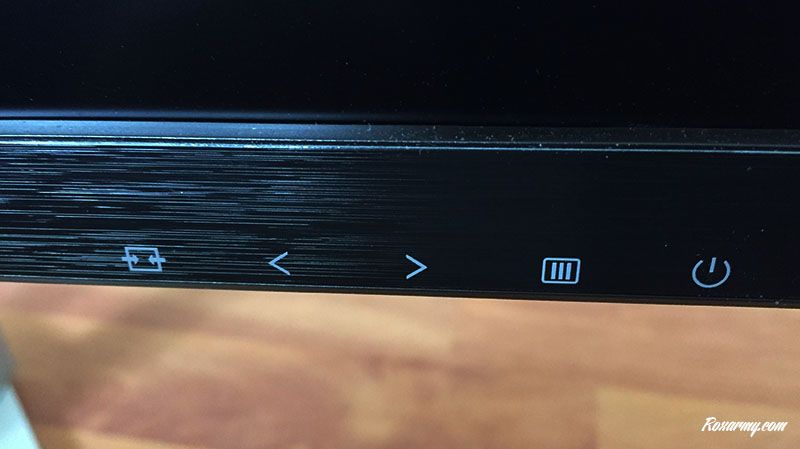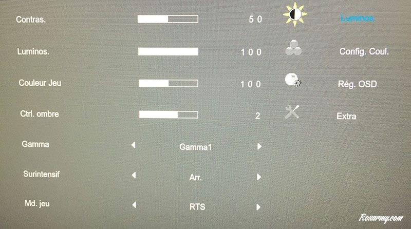 L’accès aux réglages s’effectue via 5 boutons physiques placé sous la tranche avant. Le menu digital qui s’affiche en les activant est plutôt basique. Ils se repartit en 4 catégories : la luminosité, la configuration des couleurs, les réglages OSD et les extras liés à la consommation d’énergie.