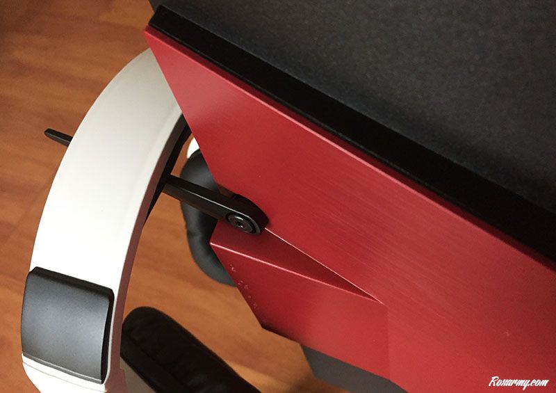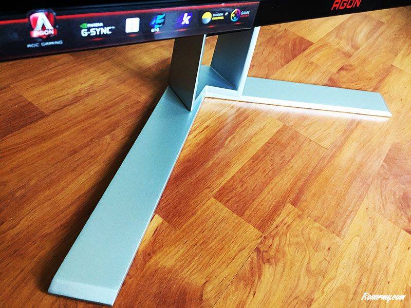 Au sortir de la boite, il est nécessaire de relier le pied au bras de l’écran. Aucun tournevis n’est requis contrairement à la fixation du bras à la dalle nécessitant 4 vis cruciformes standard. Sur le V de sa large base en métal, l’AG271UG peut pivoter d’avant en arrière entre -3 et 21°.