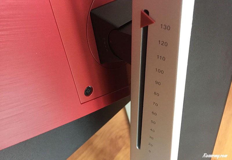 Ajustable en hauteur sur 130 mm comme l’indique la réglette incrustée sur son bras, l’écran d’AOC passe aisément du mode paysage au mode portrait. Outre le pied AOC Ergo Dial Base et le bras biseauté avec sa poignée pratique pour le transport, l’arrière du AG271UG est particulièrement travaillé.