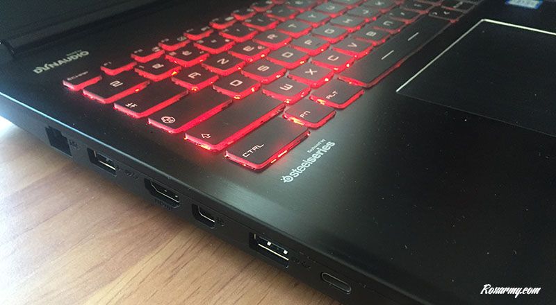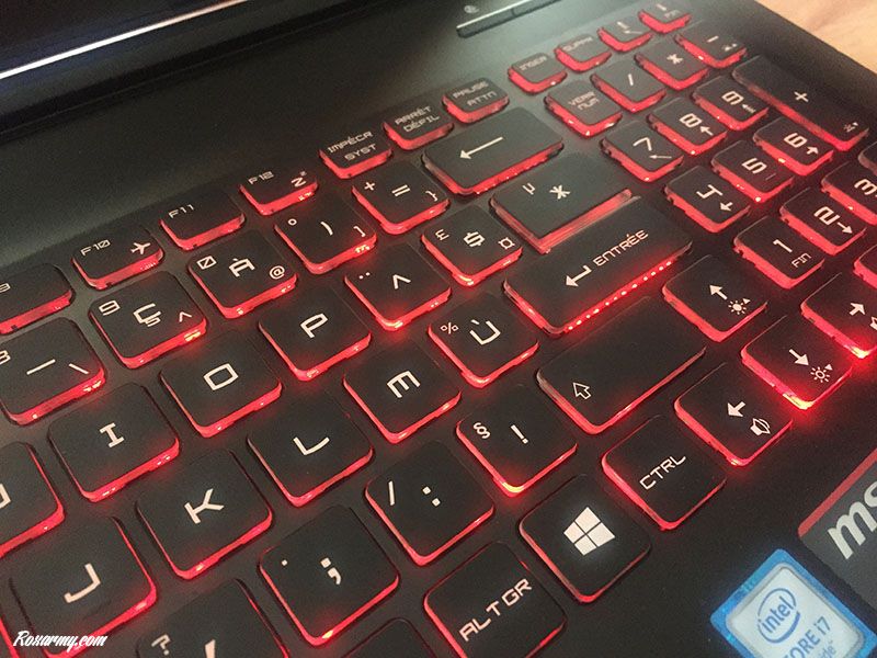 Développé de concert avec SteelSeries, il est possible d’en paramétrer le rétro éclairage avec toutes sortes de modes comme l’efficace et toujours impressionnant effet arc-en-ciel. Le trackpad est bien proportionné et le clic droit est séparé du gauche par deux boutons dédiés.