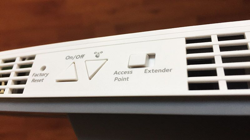 Plus imposant que d’autres répéteurs Netgear, il occupe moins de place qu’un routeur NightHawk X4S. Sur sa gauche se trouvent les boutons d’allumage et d’extinction du wifi, un orifice pour la remise aux paramètres d’usine et un permutateur pour passer du mode extension à celui de point d’accès.