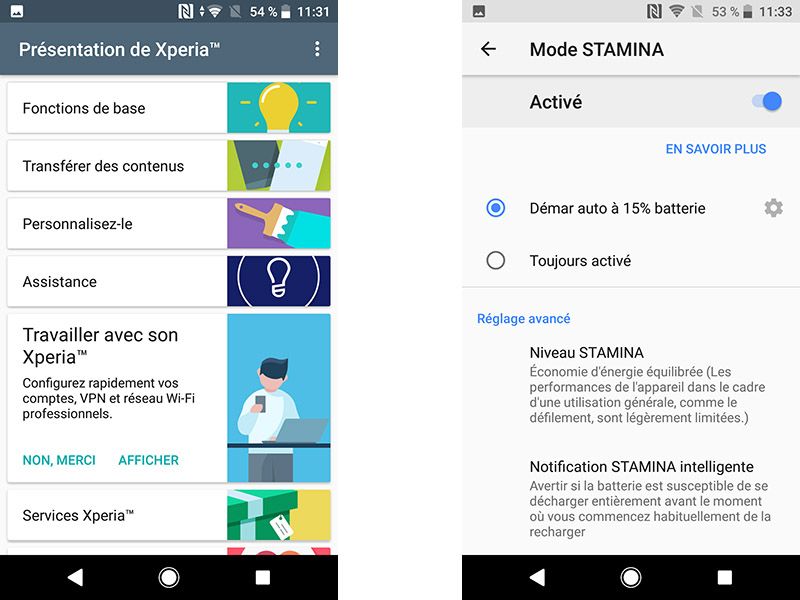 Avec une batterie de 2700 mAh, Sony a aussi mis l’Intelligence Artificielle au service de son smartphone. Après une analyse de votre besoin habituel en énergie, l’activation du mode Smart Stamina est proposée en cas de surconsommation. L’autonomie sans y avoir recours est d’une journée de travail de geek actif (nombreuses photos, réseaux sociaux et vidéos sur Youtube).