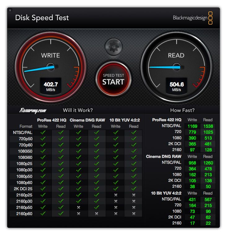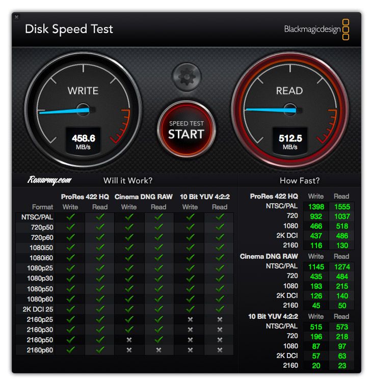 En plus de WD SSD Dashboard, le tableau de bord de surveillance, Western Digital propose le logiciel de clonage Acronis True Image utilisable seulement avec les disques de la marque en mode système. Uniquement disponibles pour Windows, leurs équivalents sur Mac ne sont toujours pas fournis.Référent dans le montage vidéo pro, Disk Speed Test de BlackMagicDesgin affiche pour le WD Blue SSD des valeurs assez proches de son homologue vert soit en lecture 504 Mb/s mais un peu en deçà en écriture 402.7 Mb/s. Pourtant un MacBook de 2011 au lieu de 2008 avec des caractéristiques de puissance et de mémoire supérieure a été utilisé.