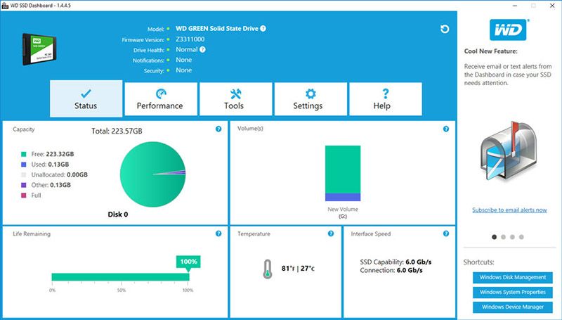 IMG_0330Pour analyser les performances, obtenir des informations sur le statut du disque ou encore effectuer diverses opérations de maintenance, Western Digital met à disposition sur son site web le logiciel particulièrement complet dénommé WD SSD Dashboard.