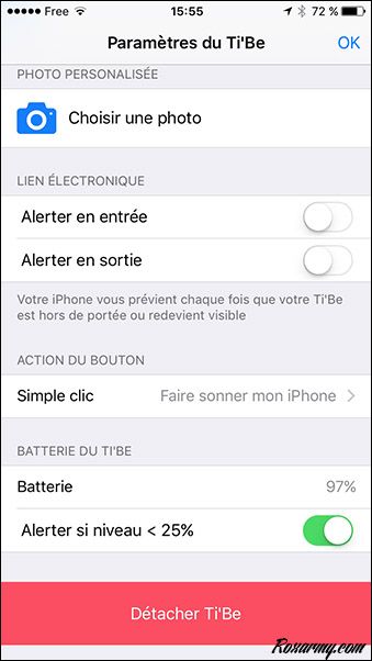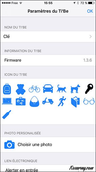A contrario, si vous savez où sont vos clés et que vous recherchez votre smartphone, vous pouviez aussi le faire sonner depuis le Ti’be. Ce dernier a également la possibilité de déclencher à distance de l’appareil photo. Vous pouvez choisir les alarmes parmi toute une liste disponible dans l’application.