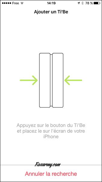Le QR code situé au dos du livret permet de retrouver directement Ti’be l’application à installer sur iOS 7 ou Android 4.3. La communication entre le iBeacon de Ticatag et votre smartphone s’effectue par bluetooth. L ‘appairage démarre après avoir pressé sur le Ti’be jusqu’au déclenchement d’un petit bip et s’être enregistré depuis l’application.